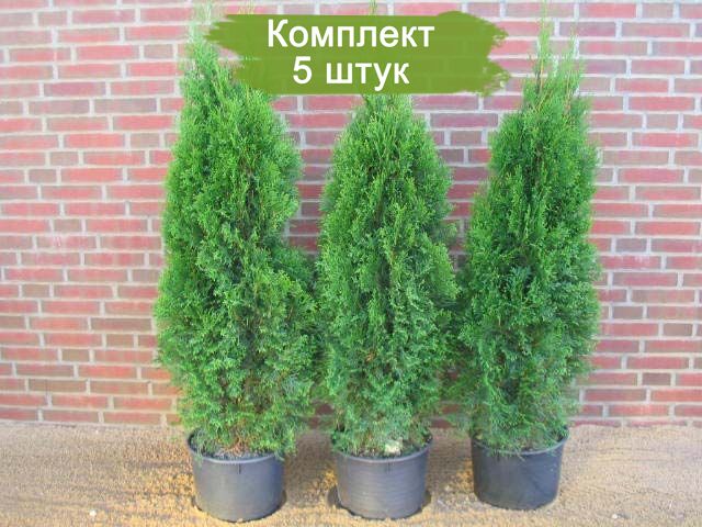 Комплект саженцев Туи Западной 'Смарагд', 5 штук по цене 4. В комплекте 5 молодых растений, каждому 2-3 года, высотой до 30 см.