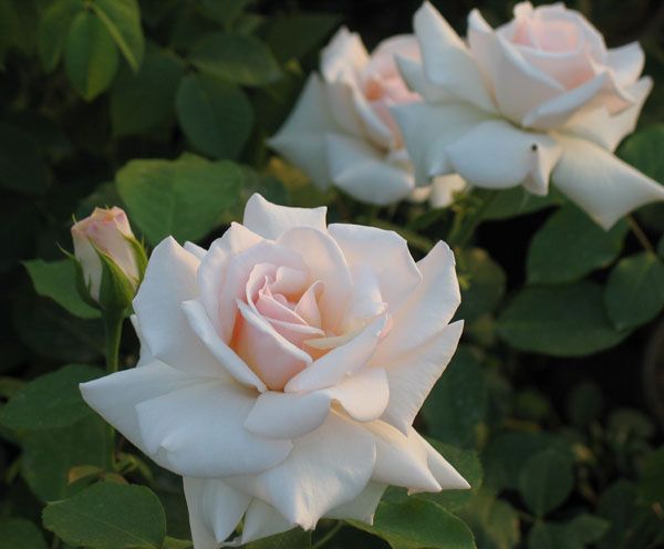 Описание: Этот сорт плетистой розы отличается элегантными цветками среднего размера (8-9 см), густомахровыми, белыми с легким розовым оттенком в центре. Цветы обладают нежным ароматом. Сорт популярен в северной Европе благодаря своей устойчивости к дождю. Куст сильнорослый, с темно-зеленой листвой, достигает высоты до 3 метров и обильно цветет повторно.